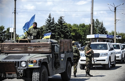 7月31日,烏克蘭政府軍車護(hù)送專家組車隊(duì)進(jìn)入墜機(jī)現(xiàn)場(chǎng)。