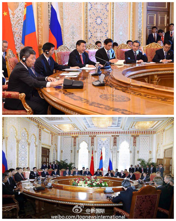 ????新華網(wǎng)北京9月12日電 據(jù)新華社“新國際”微博報道,國家主席習近平11日在出席中俄蒙三國元首會晤時說,中方提出共建絲綢之路經(jīng)濟帶倡議,獲得俄方和蒙方積極響應。我們可以把絲綢之路經(jīng)濟帶同俄羅斯跨歐亞大鐵路、蒙古國草原之路倡議進行對接,打造中蒙俄經(jīng)濟走廊。