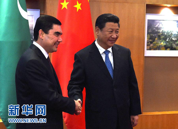 習(xí)近平指出,過去一年,我和別爾德穆哈梅多夫總統(tǒng)成功互訪,共同規(guī)劃了中土關(guān)系未來發(fā)展,推動了一系列大項(xiàng)目合作,中土戰(zhàn)略伙伴關(guān)系實(shí)現(xiàn)良好開局,兩國已成為合作共贏的利益共同體和守望相助的命運(yùn)共同體。雙方要繼續(xù)深化能源合作,確保中國-中亞天然氣管道建設(shè)和運(yùn)營,做好復(fù)興氣田二期產(chǎn)能建設(shè)。同時(shí),雙方要優(yōu)化貿(mào)易結(jié)構(gòu),逐步擴(kuò)大電力、制造業(yè)、農(nóng)業(yè)等非能源合作,共同推動絲綢之路經(jīng)濟(jì)帶建設(shè),對接兩國發(fā)展戰(zhàn)略,拉動交通、通信等領(lǐng)域合作。雙方要加強(qiáng)油氣管道和大型國際活動安保領(lǐng)域合作,共同打擊“三股勢力”。中方支持土方在中國舉辦文化日活動,愿意幫助土方推廣漢語教學(xué),促進(jìn)人文交流。