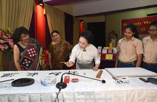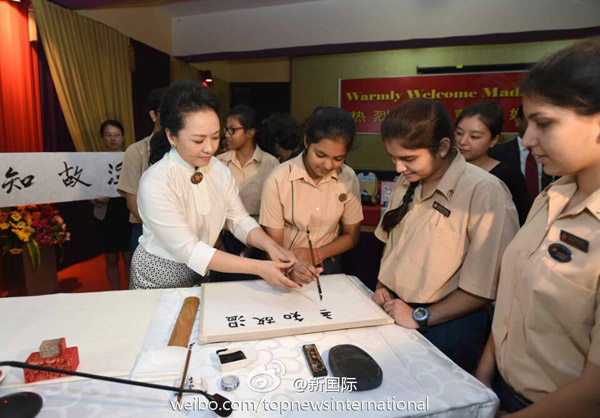 ????新華網(wǎng)北京9月18日電 據(jù)新華社“新國際”微博報(bào)道,習(xí)近平主席夫人彭麗媛18日上午在新德里參觀泰戈?duì)枃H學(xué)校時(shí),用毛筆書寫成語“溫故知新”,并簽名蓋上印章。她對師生們逐字講解后說,我們要經(jīng)常溫習(xí)學(xué)過的知識(shí),不斷學(xué)習(xí)掌握新知識(shí),開拓創(chuàng)新,與時(shí)俱進(jìn)。希望同學(xué)們認(rèn)真學(xué)習(xí),更好報(bào)效祖國,祝你們成功。