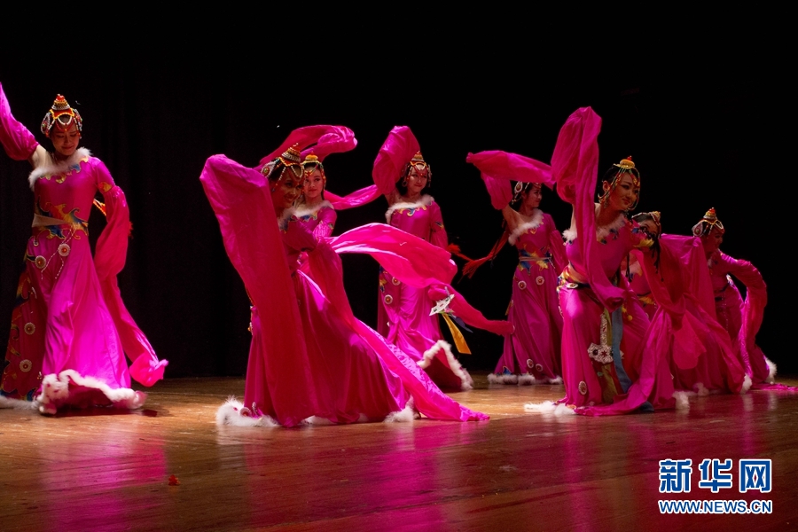 來(lái)自中南民族大學(xué)的演員在臺(tái)上表演。新華網(wǎng)發(fā) Xesco攝