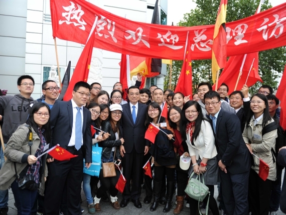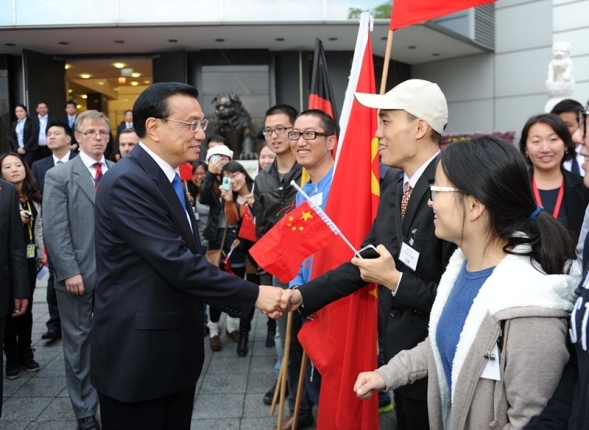 使館主樓外,還有不少中國(guó)留學(xué)生。他們打著“歡迎總理訪德”的橫幅,揮舞著中德兩國(guó)的國(guó)旗。見(jiàn)到克強(qiáng)總理走來(lái),他們一下子圍了上去,爭(zhēng)相與克強(qiáng)總理握手。