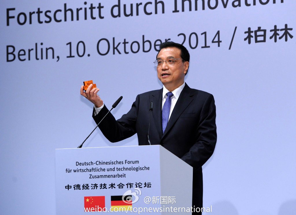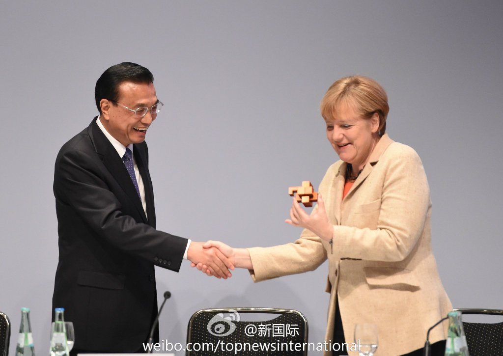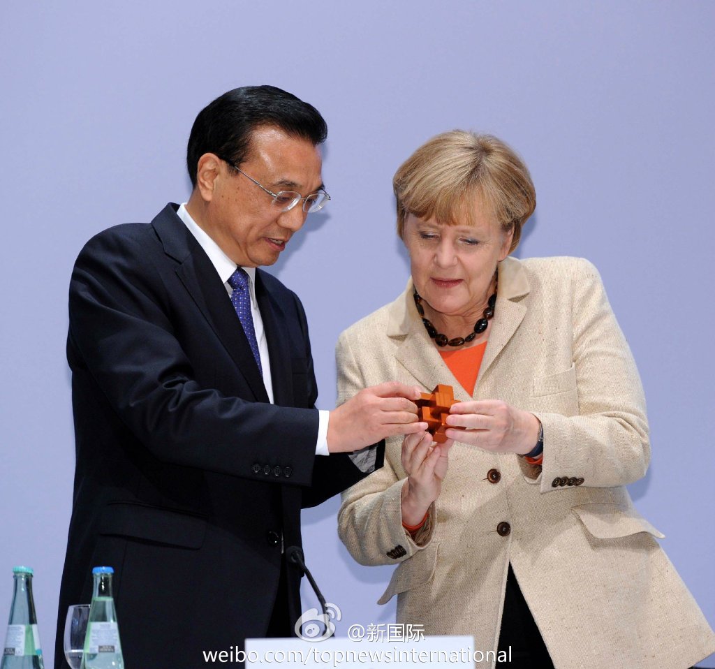 ????新華網北京10月11日電? 據(jù)新華社“新國際”微博報道,10日的中德經濟技術論壇上,李克強總理將一精巧的魯班鎖送給默克爾。他說,這是天津中德職業(yè)技術學院師生共同創(chuàng)作的作品,希望我送給默克爾總理。解開魯班鎖是解決一道難題,相信中德之間的合作能不斷創(chuàng)新,共同破解世界性難題,開啟美好的未來。