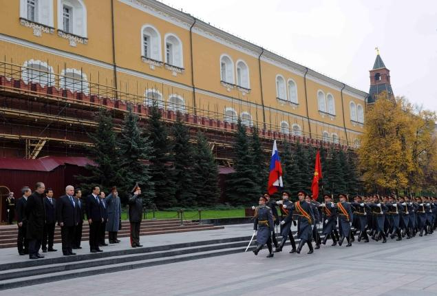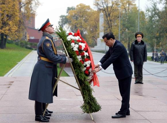 ????新華網(wǎng)北京10月14日電 據(jù)新華社“新華國際”客戶端報道,一場秋雨洗滌了莫斯科的寒夜。13日一早,克強(qiáng)總理來到克里姆林宮外的無名烈士墓,憑吊衛(wèi)國戰(zhàn)爭中的犧牲者。
