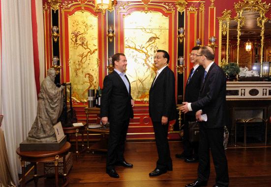 夕陽西下,秋意闌珊。梅德韋杰夫早早在官邸門口迎候克強(qiáng)總理,并請他來到金碧輝煌的“中國廳”用餐。