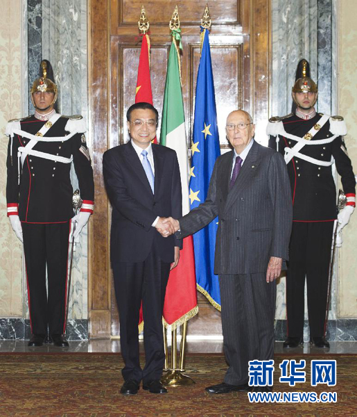 10月14日,國務(wù)院總理李克強在羅馬總統(tǒng)府會見意大利總統(tǒng)納波利塔諾。 新華社記者 謝環(huán)馳 攝