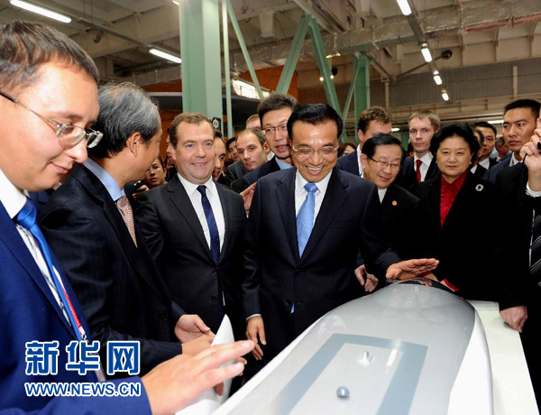 ????中國科技與創(chuàng)新展區(qū)集中展示了中國高速鐵路機車、核電、航天、高端制造和通信等領域的科研成果。在高速動車展臺前,李克強和梅德韋杰夫聽取項目負責人介紹中國自主研發(fā)的新一代高速動車組。梅德韋杰夫詢問,這種高鐵是否能在高寒地區(qū)運行。李克強說,中國高鐵擁有在高寒地區(qū)運行的豐富經(jīng)驗,技術有保障。