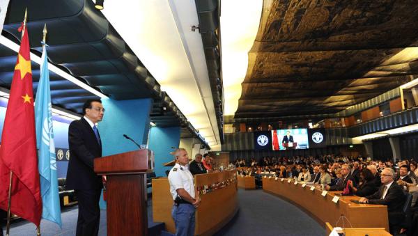 10月15日,中國國務(wù)院總理李克強在格拉齊亞諾總干事的陪同下在位于羅馬的聯(lián)合國糧農(nóng)組織總部發(fā)表演講。 新華社 圖