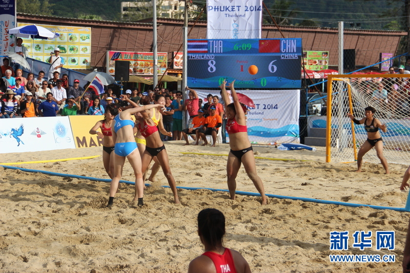 ??? 11月16日,中國沙灘手球運動員宮艷(左二)在比賽中擲球瞬間。中國體育代表團16日在泰國普吉舉行的第四屆亞洲沙灘運動會上勇奪2枚金牌和2枚銅牌。當天比賽全部結(jié)束時,中國隊以3金2銀5銅的成績暫列獎牌榜第五。新華社發(fā)(塔納攝)
