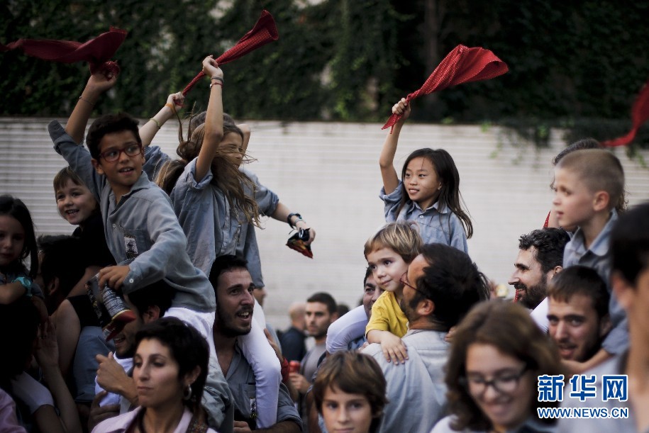 表演結束后,Jana和同伴們一起慶?!隘B人塔”成功。新華社巴塞羅那分社攝影師Pau Barrena 攝