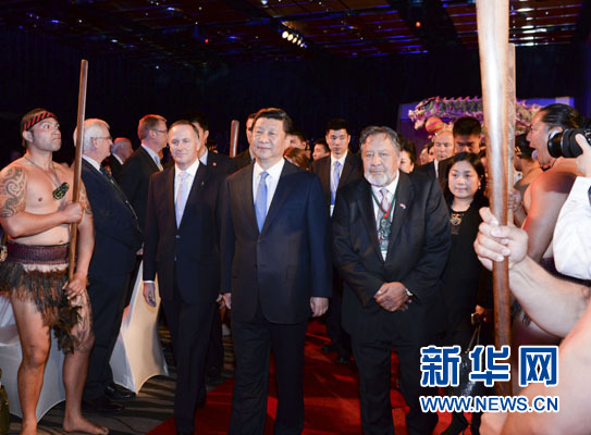 ????習(xí)近平和夫人彭麗媛抵達(dá)時,新西蘭總理約翰·基夫婦迎接,毛利族代表以傳統(tǒng)方式歡迎。在毛利族勇士和中國舞龍引領(lǐng)下,習(xí)近平和彭麗媛步入大廳,全場起立鼓掌。毛利族青年用歌聲表達(dá)喜悅和友誼。
