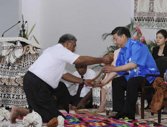 ????11月21日,國家主席習(xí)近平在楠迪出席斐濟(jì)總理姆拜尼馬拉馬舉行的傳統(tǒng)歡迎儀式。這是在歡迎儀式上,斐濟(jì)原住民按照傳統(tǒng)習(xí)俗,向習(xí)近平獻(xiàn)上寓意著平安吉祥的鯨魚牙。(攝影 饒愛民)