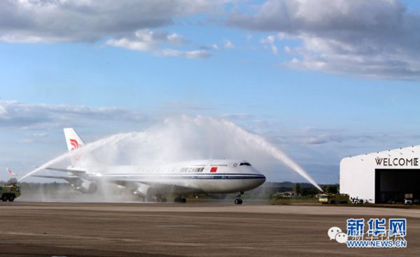 ???? ?11月21日,國家主席習(xí)近平抵達(dá)楠迪,開始對斐濟進(jìn)行國事訪問并將同太平洋建交島國領(lǐng)導(dǎo)人舉行會晤。圖為習(xí)近平乘坐的專機在楠迪國際機場跑道上滑行穿過“水門”,這是當(dāng)?shù)亟o予最尊貴客人的禮遇,表達(dá)為客人“洗塵”。 新華社記者 丁林 攝