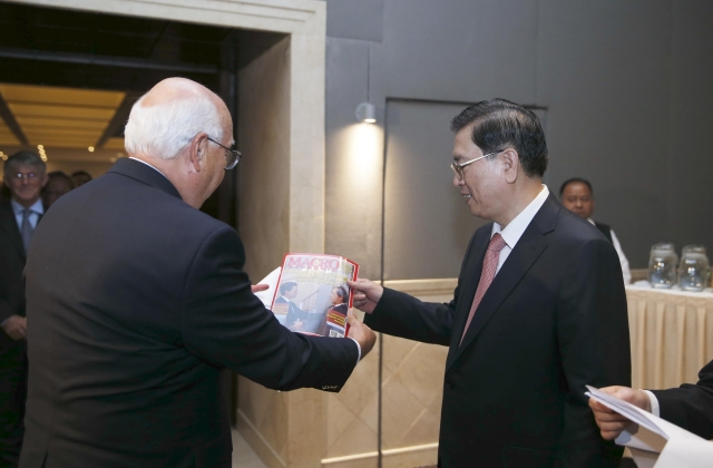 ??? 希門內(nèi)斯將最新一期《宏觀經(jīng)濟(jì)》送給張德江委員長。1972年希門內(nèi)斯首次訪華,是時任墨西哥總統(tǒng)埃切維里亞的新聞官。他后來多次到中國參觀考察,親眼目睹了中國的巨大變化。他說原來的北京是個“矮城”,樓不高,車輛少,步行的人多?,F(xiàn)在的北京“已成為高樓林立的現(xiàn)代化大都市”。