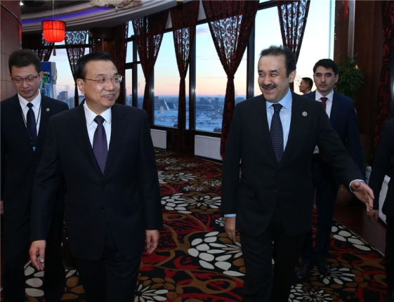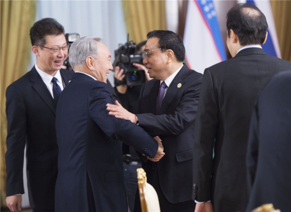 ????(納扎爾巴耶夫總統(tǒng)在集體會(huì)見上合組織成員國總理、秘書長和地區(qū)反恐機(jī)構(gòu)執(zhí)委會(huì)主任時(shí),與克強(qiáng)總理相談甚歡,攝影記者:黃敬文)