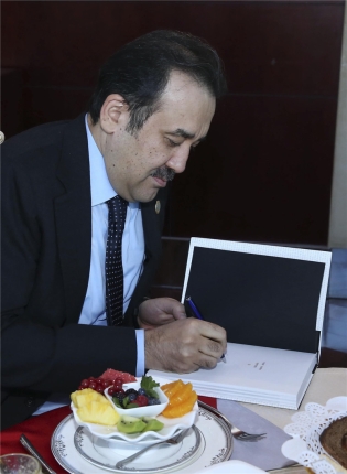 ????馬西莫夫總理則回贈(zèng)給克強(qiáng)總理自己所著《哈薩克斯坦》一書的中譯本和一個(gè)小擺件,他還特意在書的扉頁上簽上了自己的名字??磥恚@位“中國通”也希望咱們的總理更深入地了解他的國家。