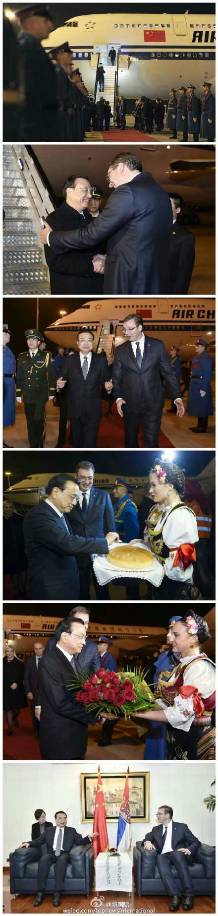 ??? 新華網(wǎng)北京12月16日電 據(jù)新華社“新國際”微博報(bào)道,當(dāng)?shù)貢r(shí)間15日晚,李克強(qiáng)總理乘專機(jī)抵達(dá)塞爾維亞首都貝爾格萊德,出席中國-中東歐領(lǐng)導(dǎo)人會晤并正式訪塞,塞總理武契奇率兩位副總理及多位部長到機(jī)場迎接,塞女青年按照迎接貴賓的傳統(tǒng)禮儀獻(xiàn)上面包和鹽請他品嘗。兩國總理在機(jī)場進(jìn)行了親切會見。