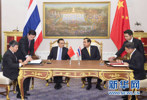 ????12月19日,國務(wù)院總理李克強(qiáng)在曼谷會見泰國總理巴育。這是會見后,兩國總理共同見證《中泰鐵路合作諒解備忘錄》和《中泰農(nóng)產(chǎn)品貿(mào)易合作諒解備忘錄》的簽署。新華社記者黃敬文攝