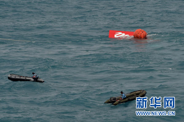 ??? 1月10日,工作人員駕駛橡皮艇協(xié)助打撈亞航失事客機的機尾殘骸。 據(jù)報道,搜救人員當日已將亞航失事客機的機尾殘骸撈出海面。 新華社發(fā)