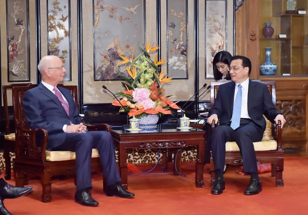 (2014年5月28日,國(guó)務(wù)院總理李克強(qiáng)在北京釣魚臺(tái)國(guó)賓館會(huì)見世界經(jīng)濟(jì)論壇主席施瓦布。新華社記者李濤攝)
