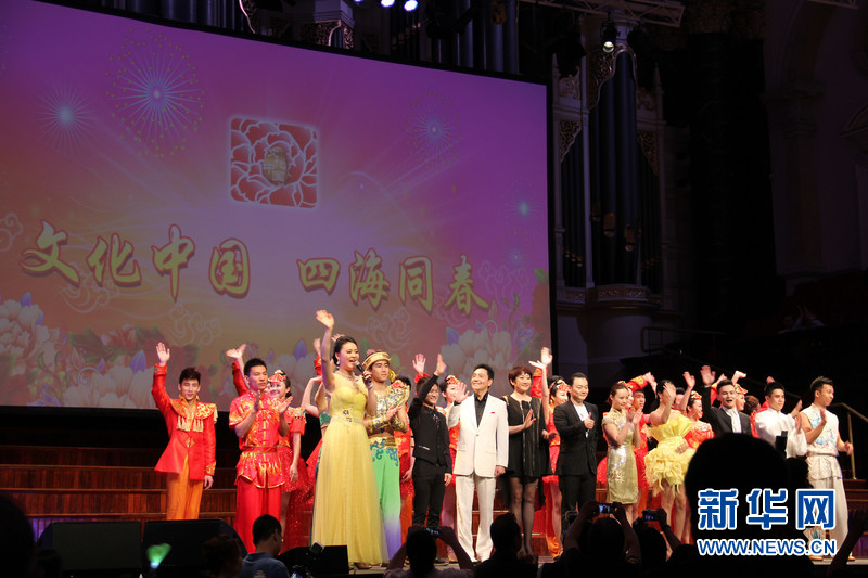 ???????? 2月25日,由中國(guó)國(guó)務(wù)院僑辦和中國(guó)海外交流協(xié)會(huì)聯(lián)合主辦的“文化中國(guó)·四海同春”在悉尼舉辦大洋洲團(tuán)的首場(chǎng)演出,歌手成方圓、中國(guó)好聲音學(xué)員李維、周深等國(guó)內(nèi)知名表演者和中澳藝術(shù)團(tuán)體為當(dāng)?shù)厝A僑華人送來新春祝福。圖為當(dāng)晚所有演員合影謝幕。新華社記者趙小娜攝