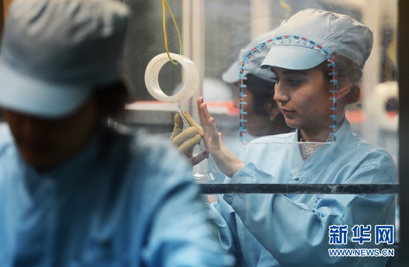 4月18日,在烏茲別克斯坦吉扎克工業(yè)特區(qū)錫爾河分區(qū)的鵬盛工業(yè)園區(qū),工人在鵬中興盛合資有限公司手機生產(chǎn)車間工作。新華社記者沙達提攝