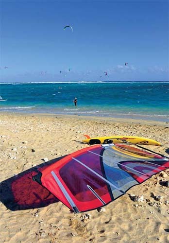 我們?cè)诹裟嵬膸滋鞎r(shí)間里風(fēng)浪都比較大,不過(guò)來(lái)到海邊卻發(fā)現(xiàn)海灘上依舊人聲鼎沸,原來(lái)好動(dòng)的法國(guó)人和一些歐美游客正利用風(fēng)浪玩起了刺激的海上運(yùn)動(dòng)。幾米高的海浪中早已有了十多名沖浪好手相繼嘗試挑戰(zhàn),雖然他們中的大部分只是業(yè)余愛(ài)好,并非職業(yè)沖浪選手,不過(guò)一招一式也是頗為認(rèn)真。靠近海岸附近的淺水區(qū)則更多是風(fēng)帆、摩托艇、皮劃艇、海浪滑板等各項(xiàng)水上運(yùn)動(dòng)的世界,對(duì)于他們來(lái)說(shuō),大風(fēng)就是運(yùn)動(dòng)的動(dòng)力,海水就是運(yùn)動(dòng)的場(chǎng)地。一般島上的家庭都會(huì)趁著周末舉家開(kāi)車(chē)來(lái)到海邊,喜歡玩水的玩水,而其他家庭成員則在沙灘上聚餐或者聊天,如此融入大自然真是瀟灑。