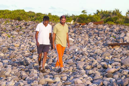 當(dāng)?shù)貢r間7月30日,約翰尼·貝格(右)和朋友一起在海灘上行走,他正是在法屬留尼旺島上發(fā)現(xiàn)疑似MH370殘骸的人。CFP供圖