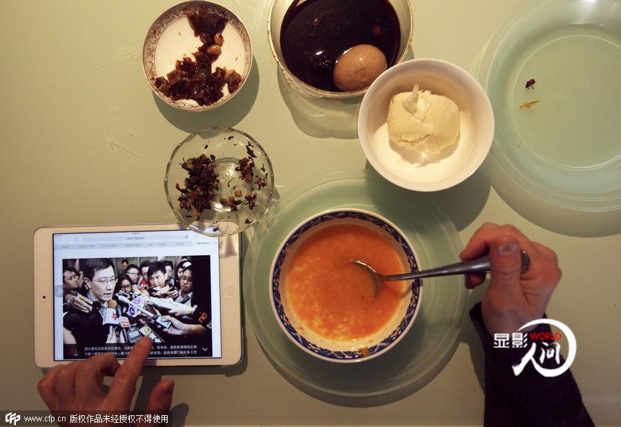 2014年3月11日,山東濟南,一名市民一邊吃著早餐,一邊翻閱IPAD,關(guān)注失聯(lián)航班MH370的最新動態(tài)。