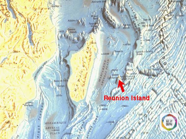 (留尼汪島附近的印度洋海底地形圖,紅色箭頭所指的為留尼汪島,圖上可見(jiàn)大面積隆起的海脊)