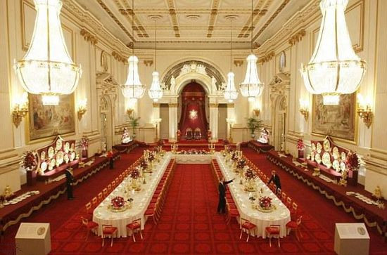 36.6米長、18米寬、13.5米高的宴會(huì)廳(the Ballroom)是白金漢宮最大的房間,女王招待國外元首的國宴都在這里舉行。國宴一般由四道菜組成,白金漢宮的廚房可以同時(shí)供應(yīng)600位賓客一起用餐。