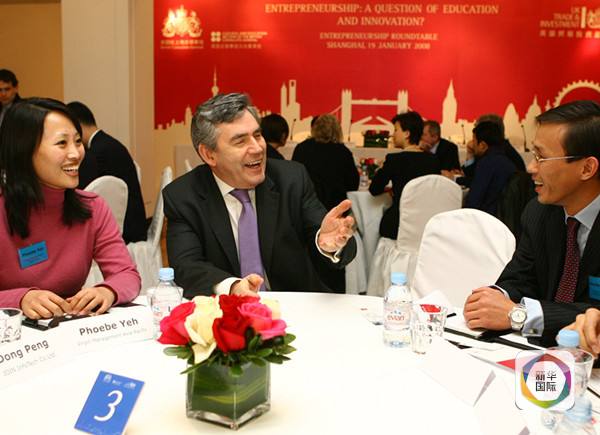 ????2008年1月19日,英國(guó)首相布朗(中)在上海與中國(guó)企業(yè)家座談。