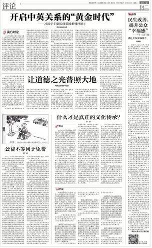 英國駐華大使吳百納連續(xù)用了四個(gè)“黃金”來形容習(xí)近平主席此次訪英的意義:“今年是中英關(guān)系的黃金年,這將是一次黃金訪問,它證明中英關(guān)系的發(fā)展處于黃金時(shí)期。訪問將確立中英面向21世紀(jì)的全球伙伴關(guān)系,開啟中英關(guān)系史上的黃金10年?!蔽覀兤诖⑾嘈?,這次為開啟中英關(guān)系“黃金時(shí)代”而往的里程碑式訪問,一定能成功打造中英關(guān)系新格局、繪制兩國關(guān)系新藍(lán)圖、開辟務(wù)實(shí)合作新前景、樹立國際合作新典范。(南方日報(bào)評論員)