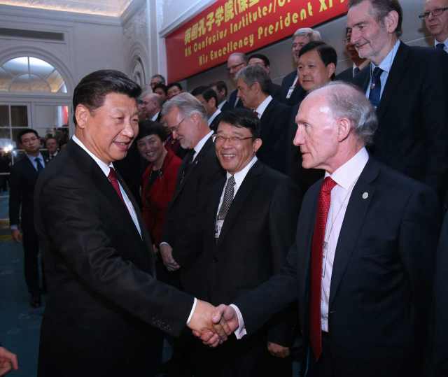 習近平指出,近年來,孔子學院在英國快速發(fā)展。目前,英國已經(jīng)建立起29所孔子學院和126個孔子課堂,數(shù)量居歐洲之首。全英孔子學院取得的碩果也是中英人文交流蓬勃發(fā)展的縮影。通過人文交流,中英兩國文化中的精華正在對兩國人民的思維方式和生活方式產(chǎn)生著奇妙的“化學反應”?!盀橹粎?,誨人不倦?!毕M谧魑唤處熢俳釉賲枺瑸橹杏⒂押檬聵I(yè)添磚加瓦。希望孔子學院繼續(xù)秉承“相互尊重、友好協(xié)商、平等互利”的校訓,為傳播文化、溝通心靈、促進世界文明多樣性作出新的更大貢獻。