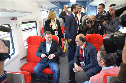當(dāng)天,馬其頓鐵路運(yùn)輸公司為其從中國中車集團(tuán)株洲電力機(jī)車有限公司采購的首列電力動車組舉行試運(yùn)行儀式。格魯埃夫斯基等多名馬其頓政府高官、馬鐵路運(yùn)輸公司總經(jīng)理科斯托夫、中國駐馬其頓大使溫振順應(yīng)邀出席儀式并試乘動車組。