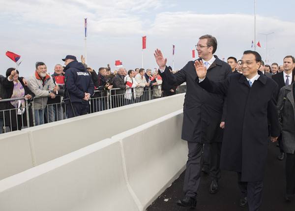 2014年12月18日,李克強總理與塞爾維亞總理武契奇共同出席貝爾格萊德跨多瑙河大橋竣工儀式。這是李克強與武契奇在儀式現(xiàn)場向民眾揮手致意。(新華社記者黃敬文攝)