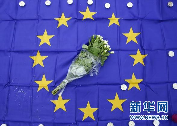 3月23日,在比利時(shí)首都布魯塞爾市中心的股票交易所前,一束鮮花和蠟燭擺放在歐盟旗幟上。當(dāng)日,數(shù)千民眾自發(fā)聚集在股票交易所前,為恐怖襲擊遇難者集體默哀。 新華社記者 葉平凡 攝