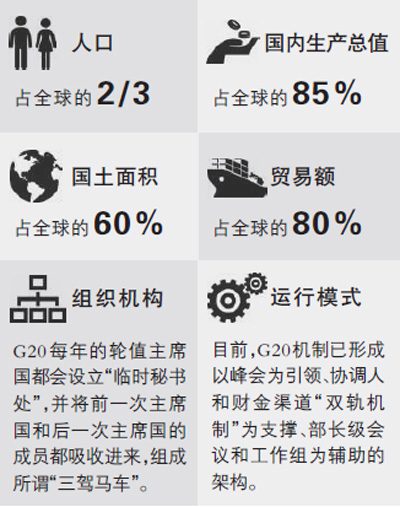 成員:包括美國(guó)、日本、德國(guó)、法國(guó)、英國(guó)、意大利、加拿大、俄羅斯、韓國(guó)、澳大利亞、南非、阿根廷、巴西、印度、印度尼西亞、墨西哥、沙特阿拉伯、土耳其、中國(guó)和作為一個(gè)實(shí)體的歐盟。記者 王慧敏 王新萍 方 敏