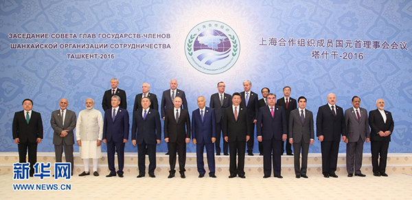 6月24日,國家主席習(xí)近平在烏茲別克斯坦塔什干出席上海合作組織成員國元首理事會第十六次會議并發(fā)表重要講話。這是大范圍會談開始前,習(xí)近平同哈薩克斯坦總統(tǒng)納扎爾巴耶夫、吉爾吉斯斯坦總統(tǒng)阿坦巴耶夫、俄羅斯總統(tǒng)普京、塔吉克斯坦總統(tǒng)拉赫蒙、烏茲別克斯坦總統(tǒng)卡里莫夫,觀察員國阿富汗總統(tǒng)加尼、白俄羅斯總統(tǒng)盧卡申科、印度總理莫迪、蒙古國總統(tǒng)額勒貝格道爾吉、巴基斯坦總統(tǒng)侯賽因、伊朗外交部長扎里夫,主席國客人土庫曼斯坦總統(tǒng)別爾德穆哈梅多夫以及有關(guān)國際和地區(qū)組織代表集體合影。新華社記者 丁林 攝