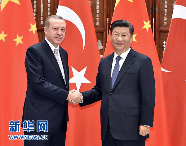 9月3日,國家主席習(xí)近平在杭州會(huì)見來華出席二十國集團(tuán)領(lǐng)導(dǎo)人杭州峰會(huì)的土耳其總統(tǒng)埃爾多安。 新華社記者 李濤 攝