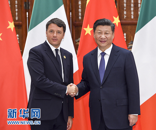 習近平歡迎倫齊來華出席二十國集團領導人杭州峰會。習近平指出,近年來,中意關系取得長足進步,雙方秉承相互尊重、互利共贏精神,深化政治互信,擴大務實合作,使兩國人民獲得實實在在的利益。中方愿同意方攜手努力,不斷推進兩國全面戰(zhàn)略伙伴關系向前發(fā)展。我們要堅持兩國戰(zhàn)略互信大方向,尊重彼此核心利益和重大關切,密切兩國政府、議會、政黨交流合作。要堅持互利共贏原則,優(yōu)勢互補,實現(xiàn)共同發(fā)展。中方歡迎意方積極參與“一帶一路”建設。我們要以古老文明為依托,密切人文交流,深化傳統(tǒng)友誼。要加強在國際和地區(qū)事務中的協(xié)調(diào)和配合,努力構(gòu)建以合作共贏為核心的新型國際關系。要將中歐和平、增長、改革、文明四大伙伴關系落到實處,共同維護中歐關系良好發(fā)展勢頭。