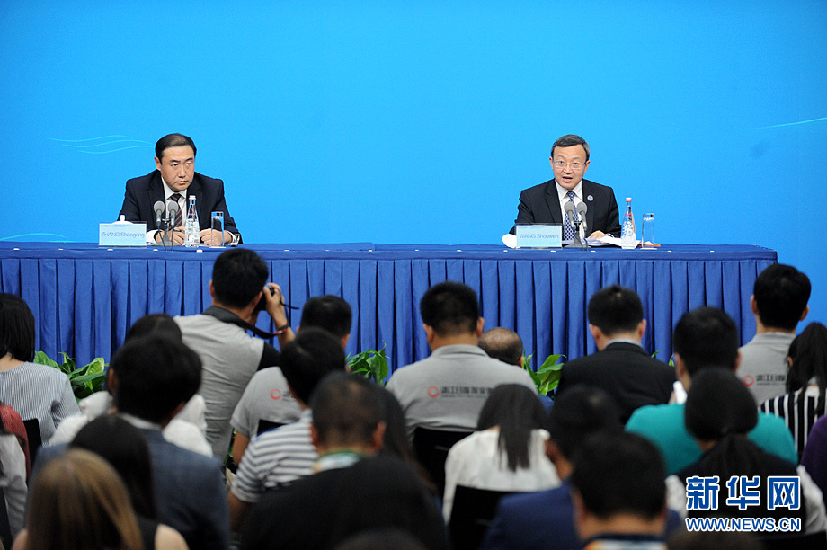 9月3日,中國代表團在浙江杭州舉行新聞發(fā)布會,商務(wù)部副部長王受文就G20杭州峰會經(jīng)貿(mào)成果展望向記者介紹情況并回答提問。新華網(wǎng)記者?陳競超 攝