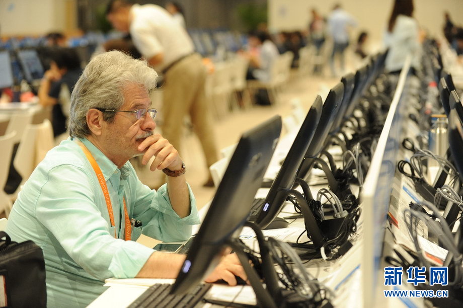 工商峰會開幕 新聞中心內(nèi)專注而忙碌的記者們