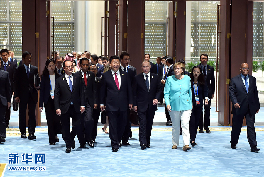 ??? 9月4日,二十國(guó)集團(tuán)領(lǐng)導(dǎo)人第十一次峰會(huì)在杭州國(guó)際博覽中心舉行。國(guó)家主席習(xí)近平主持會(huì)議并致開(kāi)幕辭。這是二十國(guó)集團(tuán)成員和嘉賓國(guó)領(lǐng)導(dǎo)人、有關(guān)國(guó)際組織負(fù)責(zé)人步入會(huì)場(chǎng)。新華社記者李濤攝