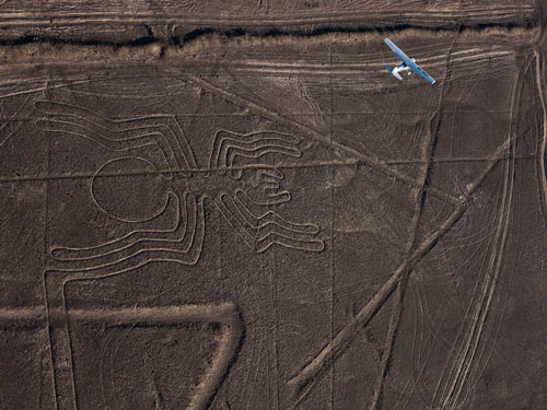 ????站在地面上的話,你幾乎看不到納斯卡線,它們由淺色泥土畫成,兩邊由深色石頭畫的線來(lái)提亮。這個(gè)地區(qū)有數(shù)量眾多的納斯卡線——長(zhǎng)達(dá)幾千米的碎片狀的三角形和矩形,非寫實(shí)的動(dòng)物和鳥類圖案:一只猴子,一只禿鷹,一只完全對(duì)稱的蜘蛛,一只蜂鳥。
