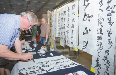 日內(nèi)瓦大學(xué)孔子學(xué)院舉辦的中國書法展示活動上,一位當(dāng)?shù)貪h語愛好者展示書法技藝。