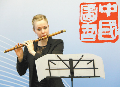 1月11日,在瑞士蘇黎世大學(xué),一名當(dāng)?shù)貙W(xué)生在“中國圖書中心”揭幕儀式上表演笛子獨奏。