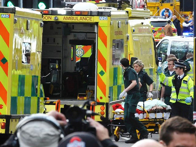 3月22日,倫敦議會(huì)大廈外,救援人員將一名傷者推向救護(hù)車。(新華/法新)