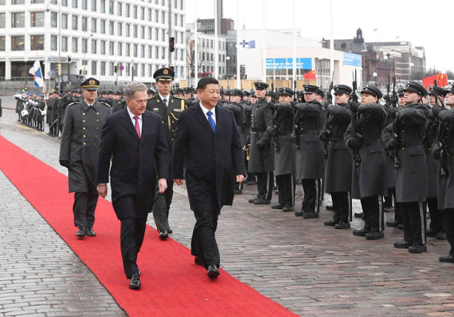 4月5日,國(guó)家主席習(xí)近平在赫爾辛基同芬蘭總統(tǒng)尼尼斯托舉行會(huì)談。會(huì)談前,習(xí)近平出席尼尼斯托在總統(tǒng)府庭院舉行的隆重歡迎儀式。(新華社記者饒愛(ài)民攝)