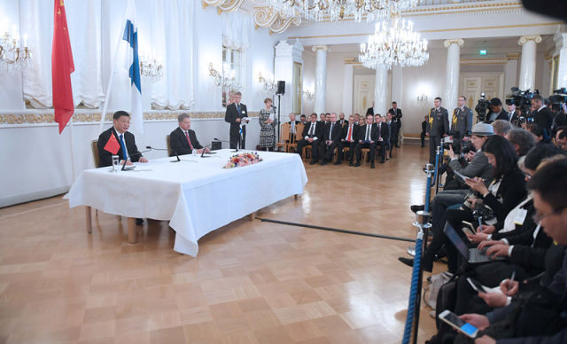 4月5日,國(guó)家主席習(xí)近平在赫爾辛基同芬蘭總統(tǒng)尼尼斯托舉行會(huì)談。(新華社記者張鐸攝)